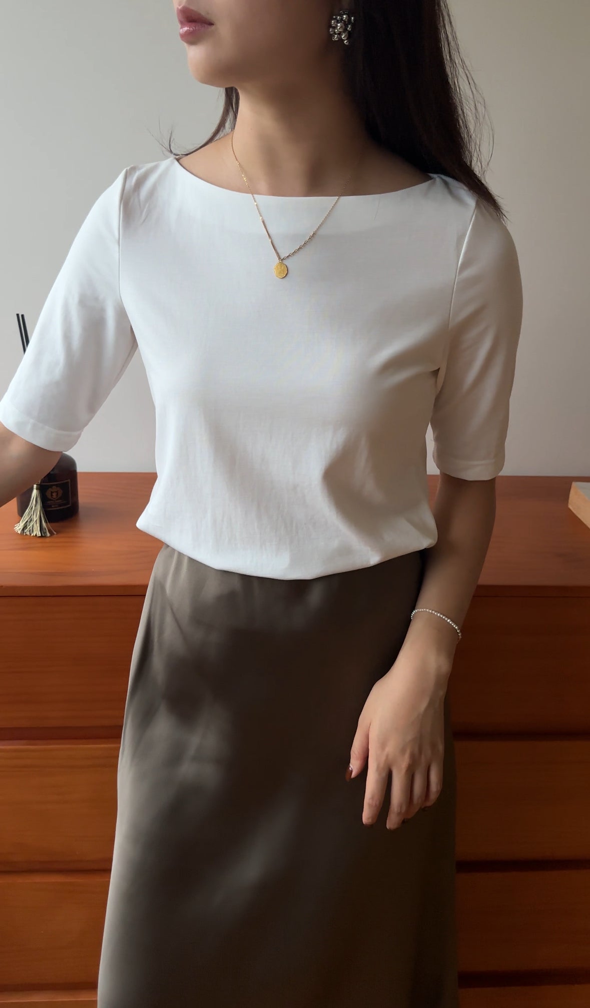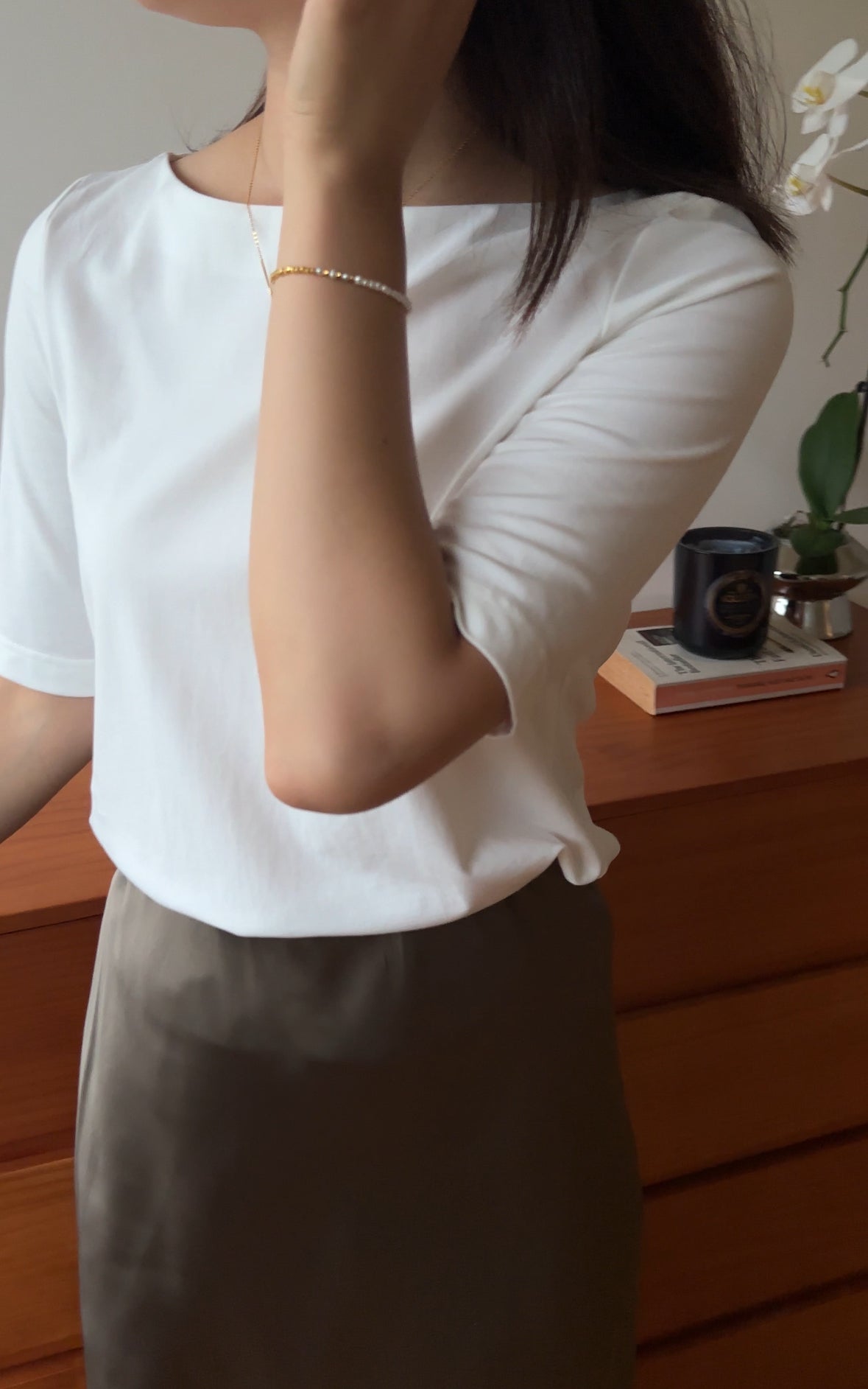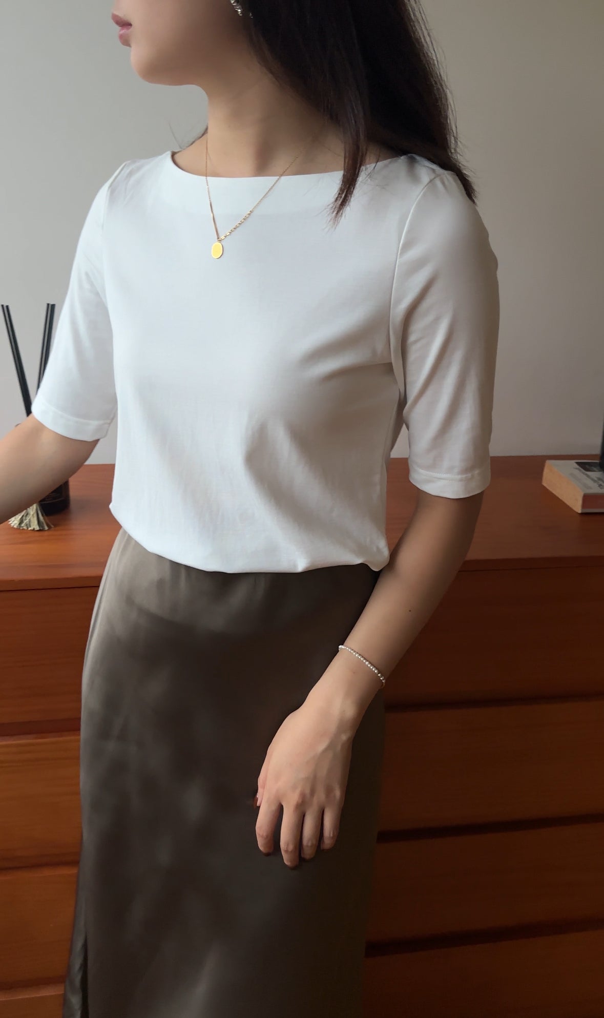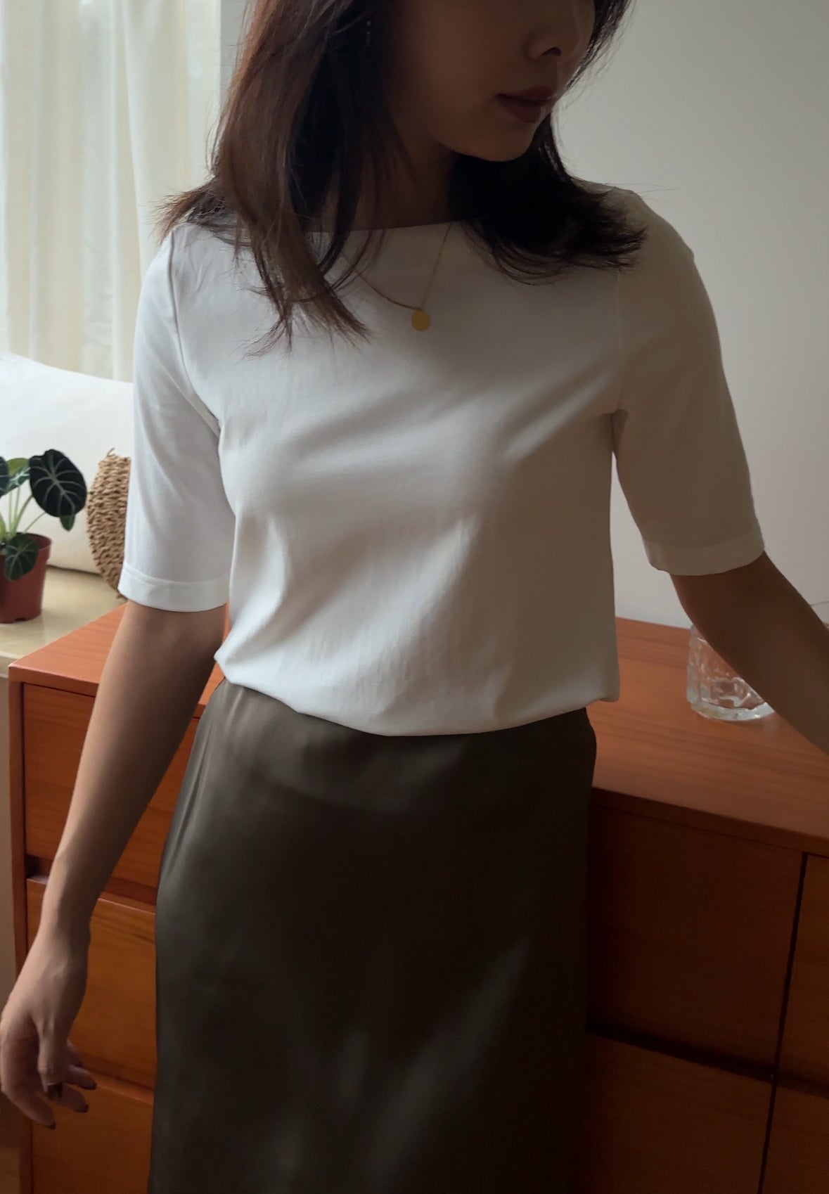 FC09302 Premium Roma Cotton Boat Neck Midi-Sleeve Basic T-shirt White