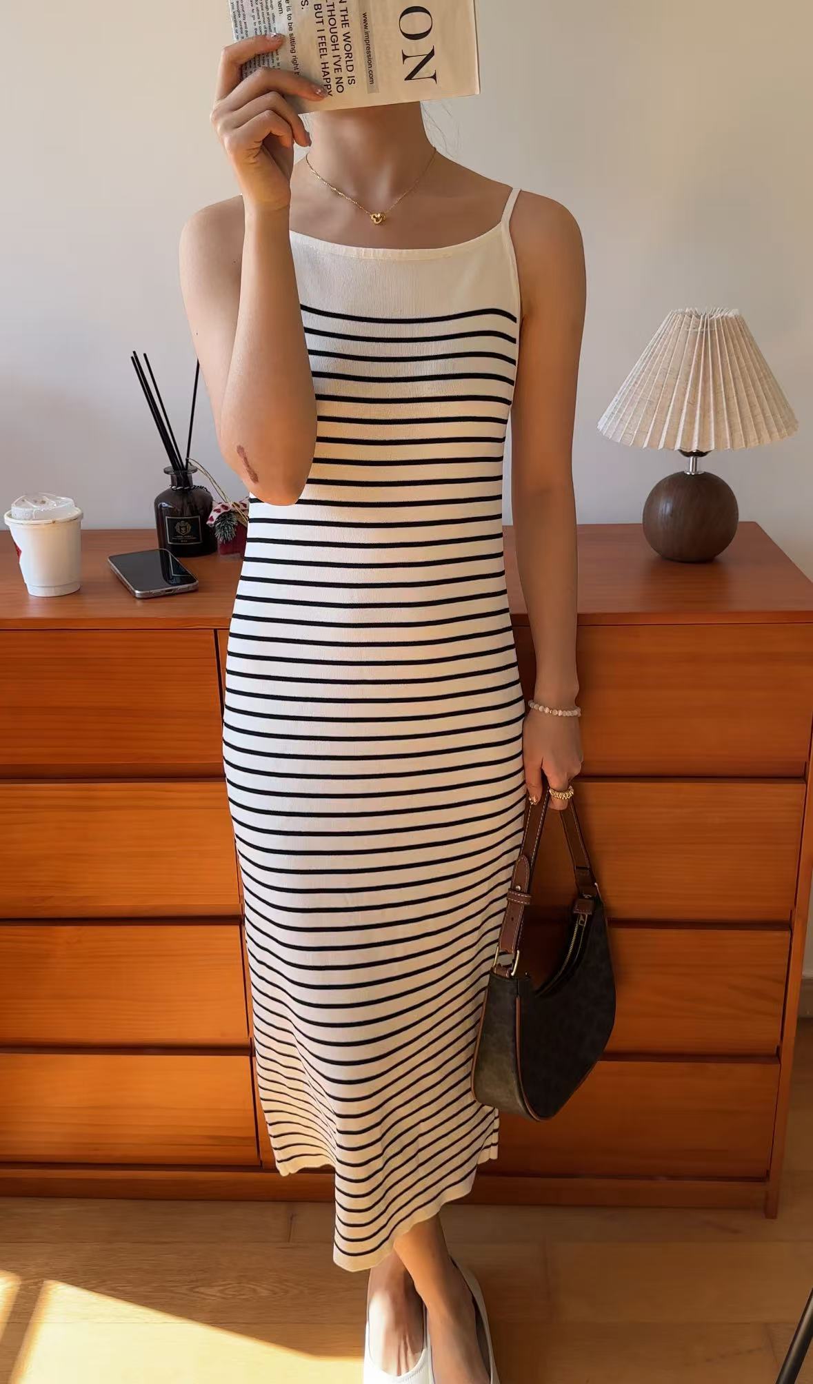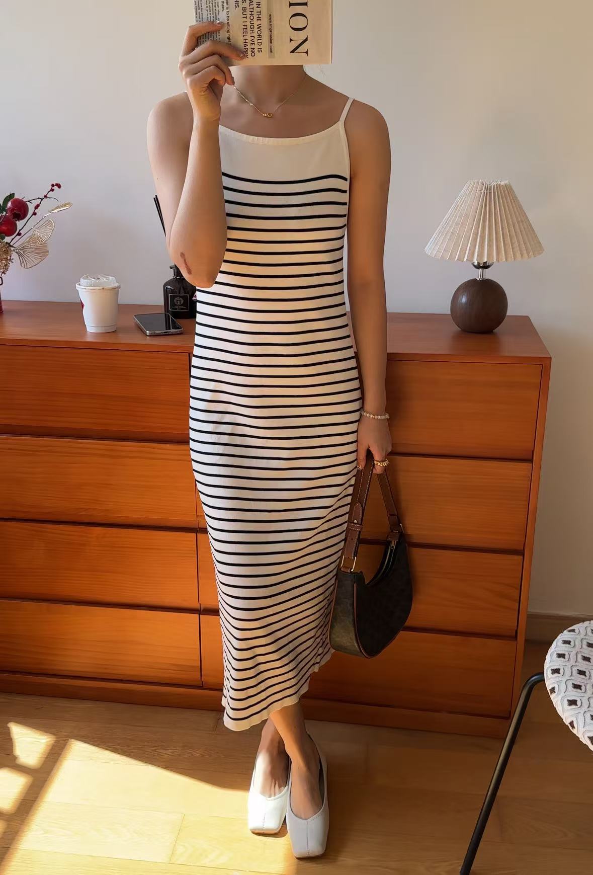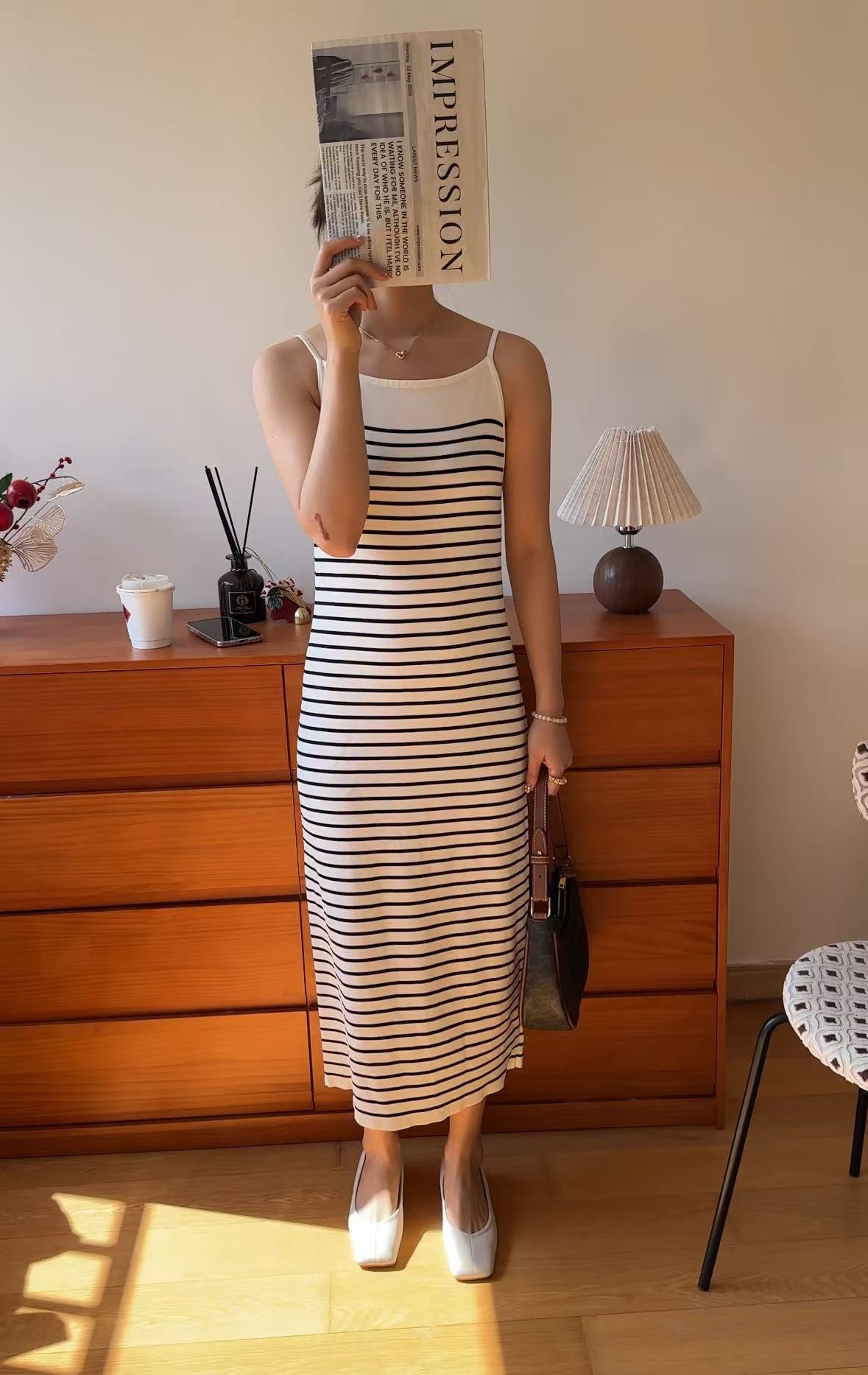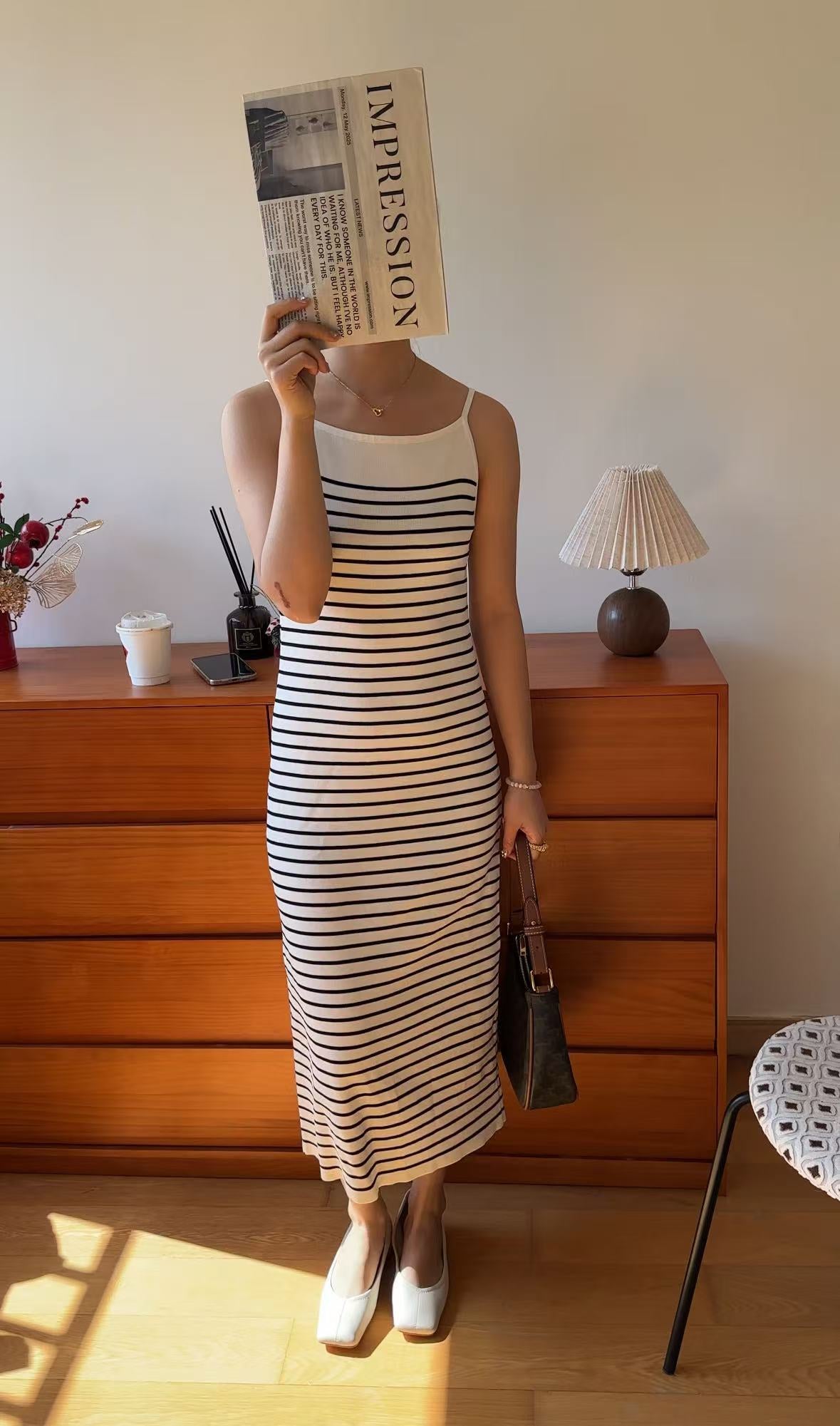 GC01151 Spring Collection NEW Premium Cos Fabric Boat Neck Striped Knitted Slip Dress