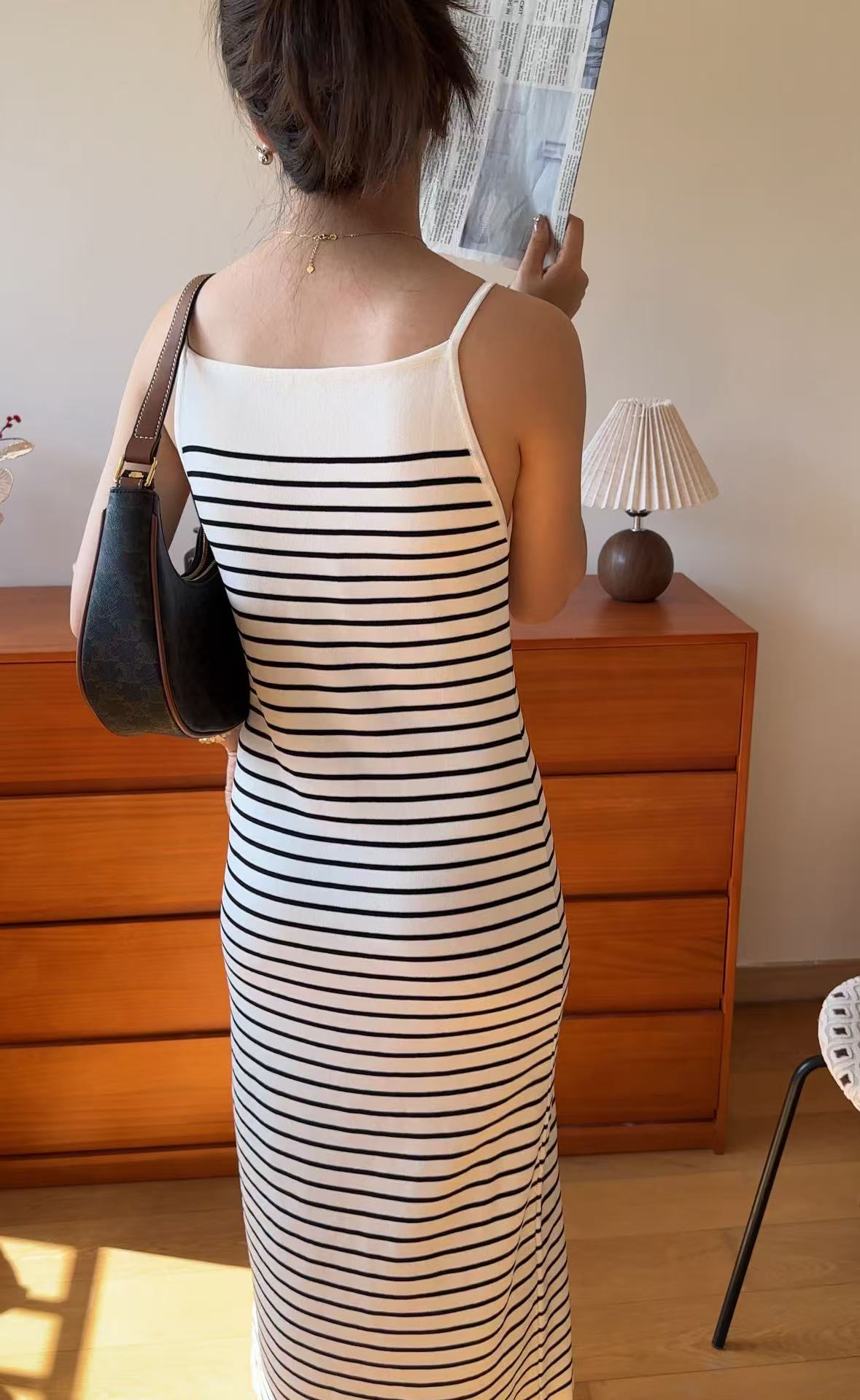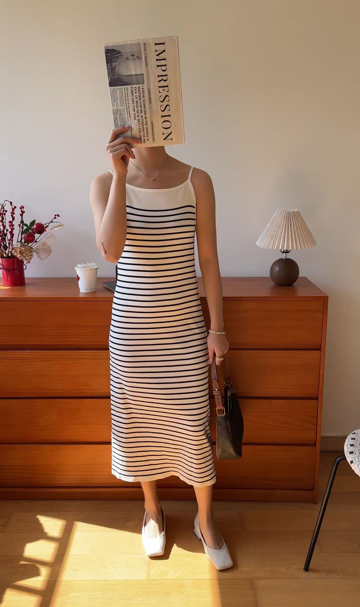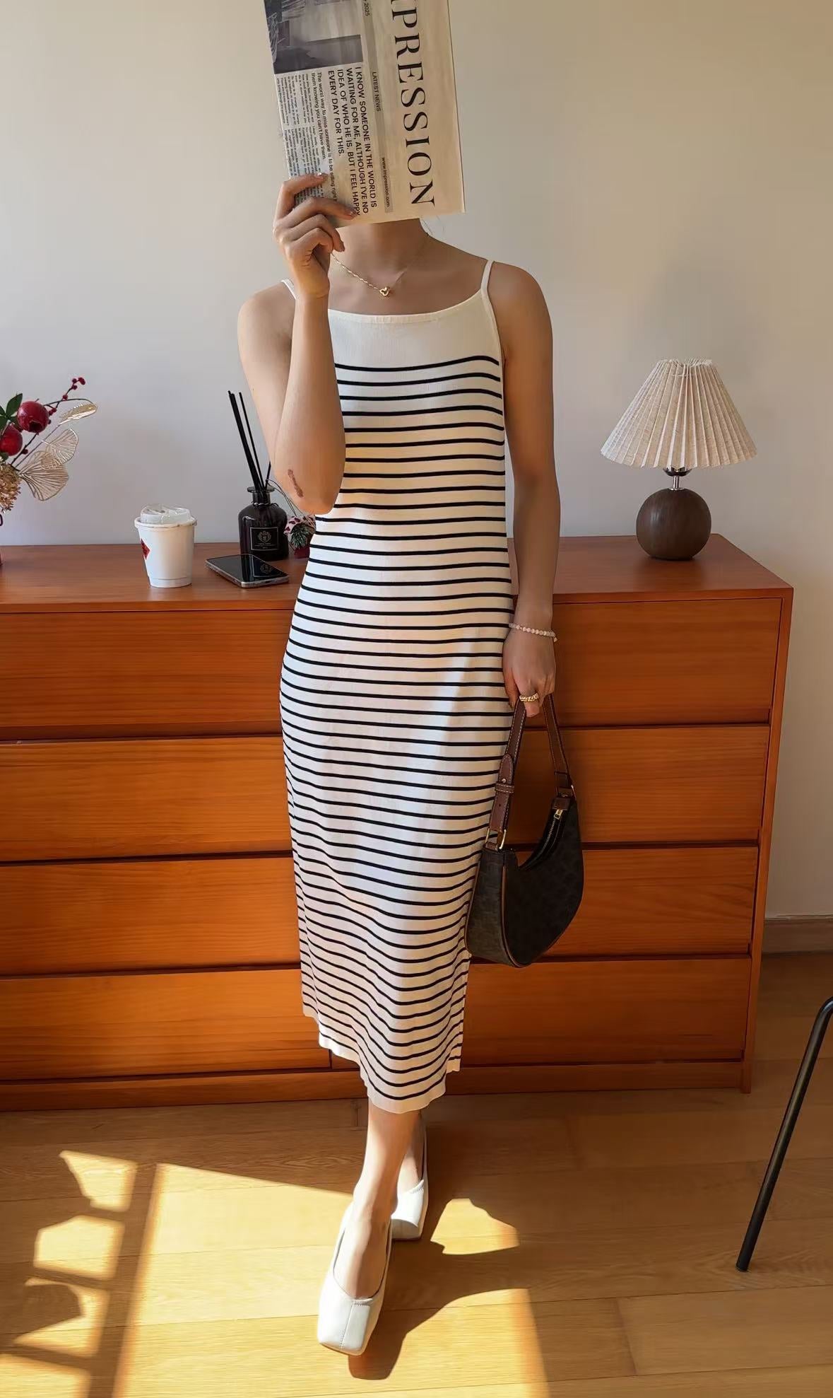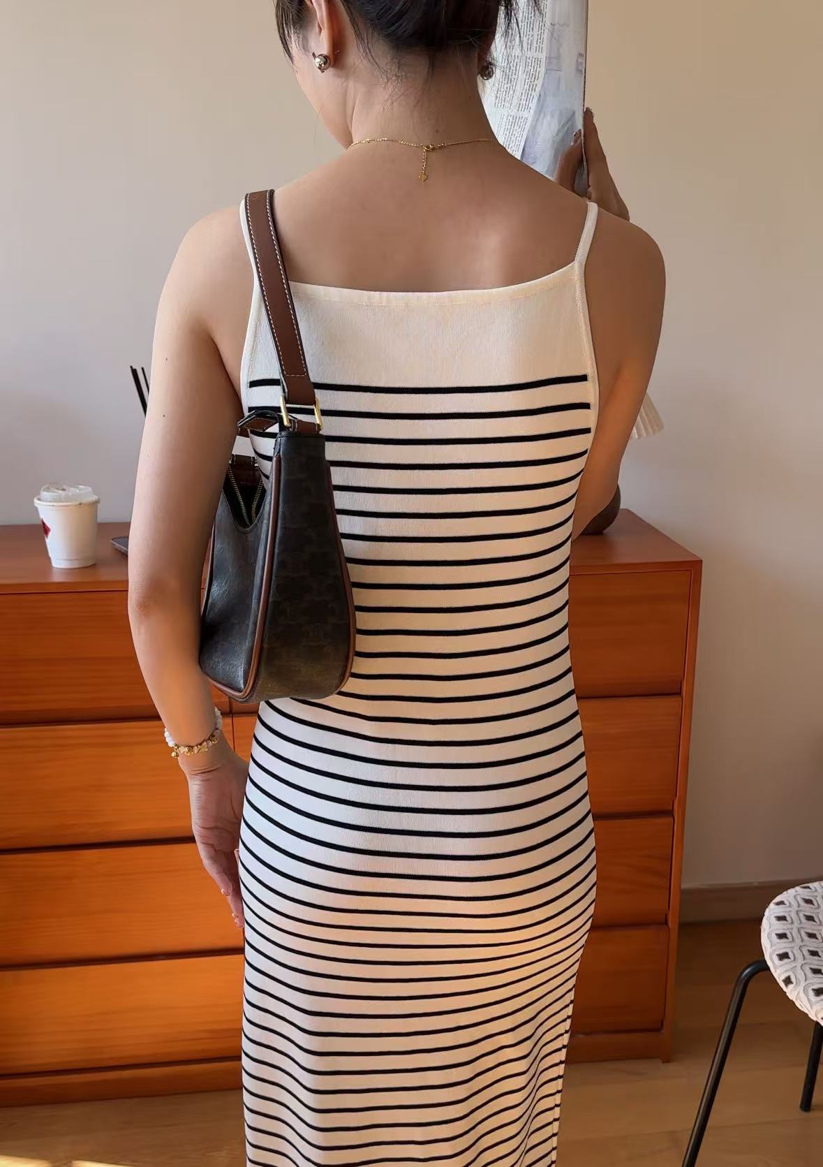GC01151 Spring Collection NEW Premium Cos Fabric Boat Neck Striped Knitted Slip Dress