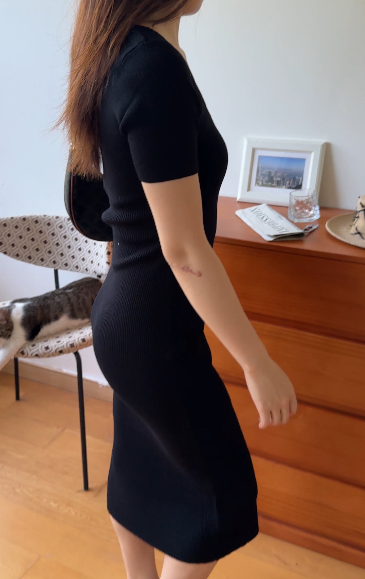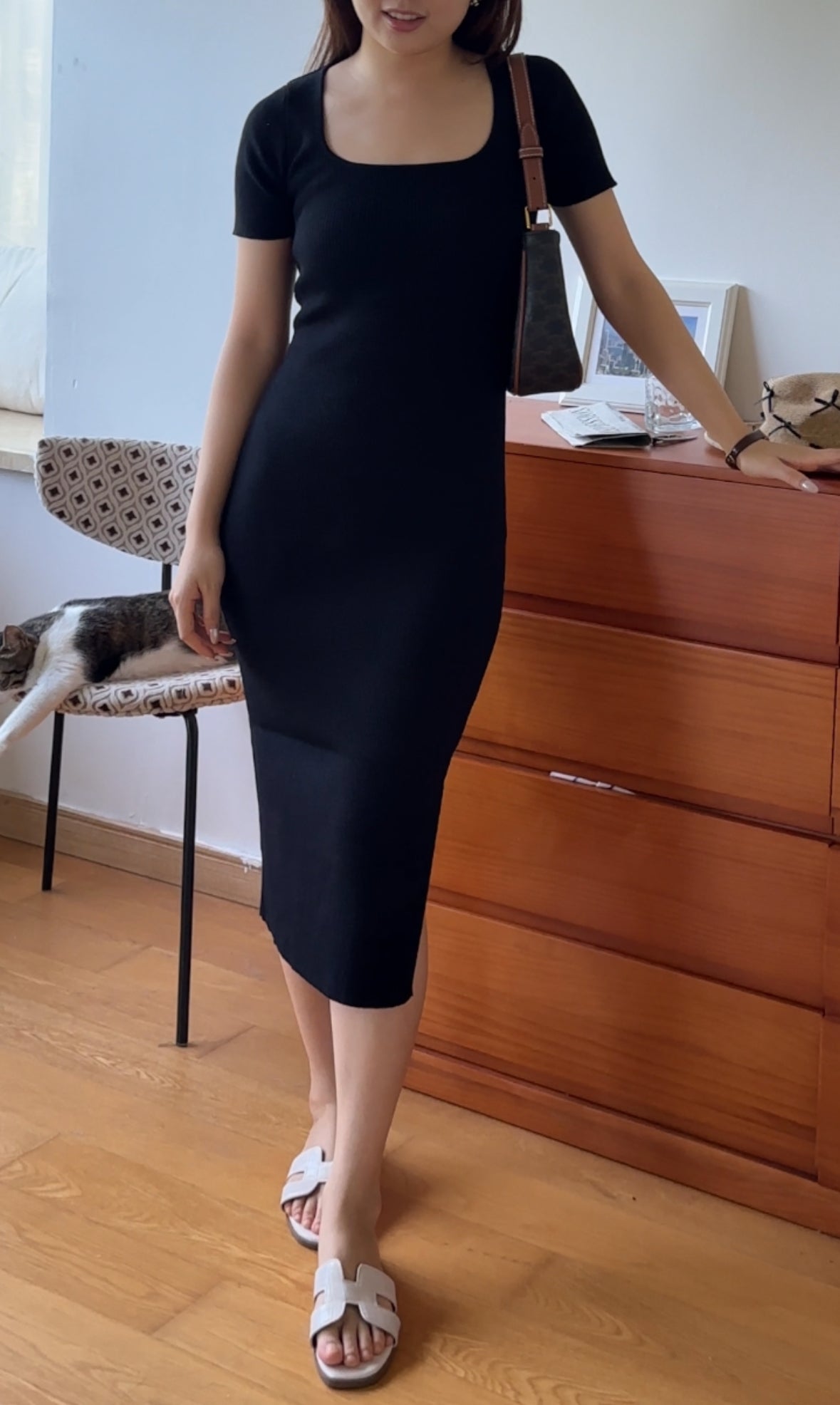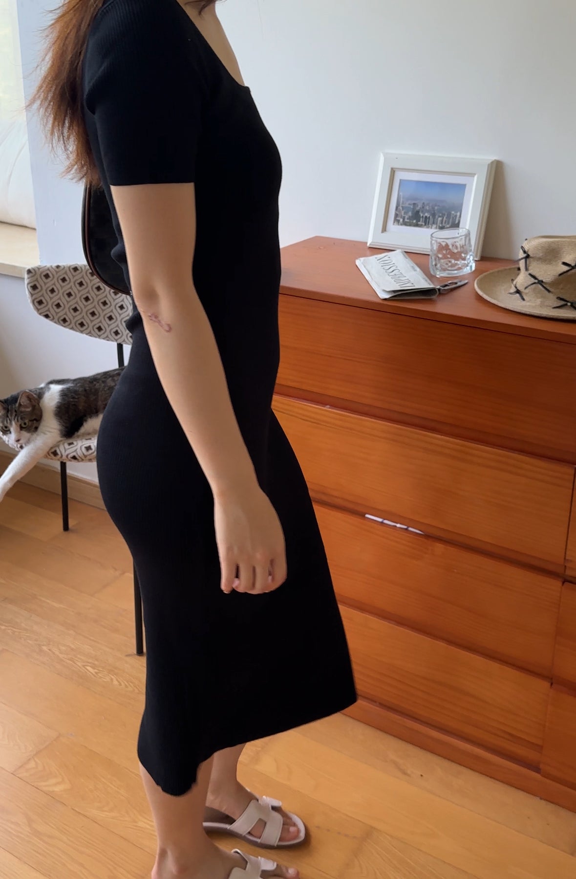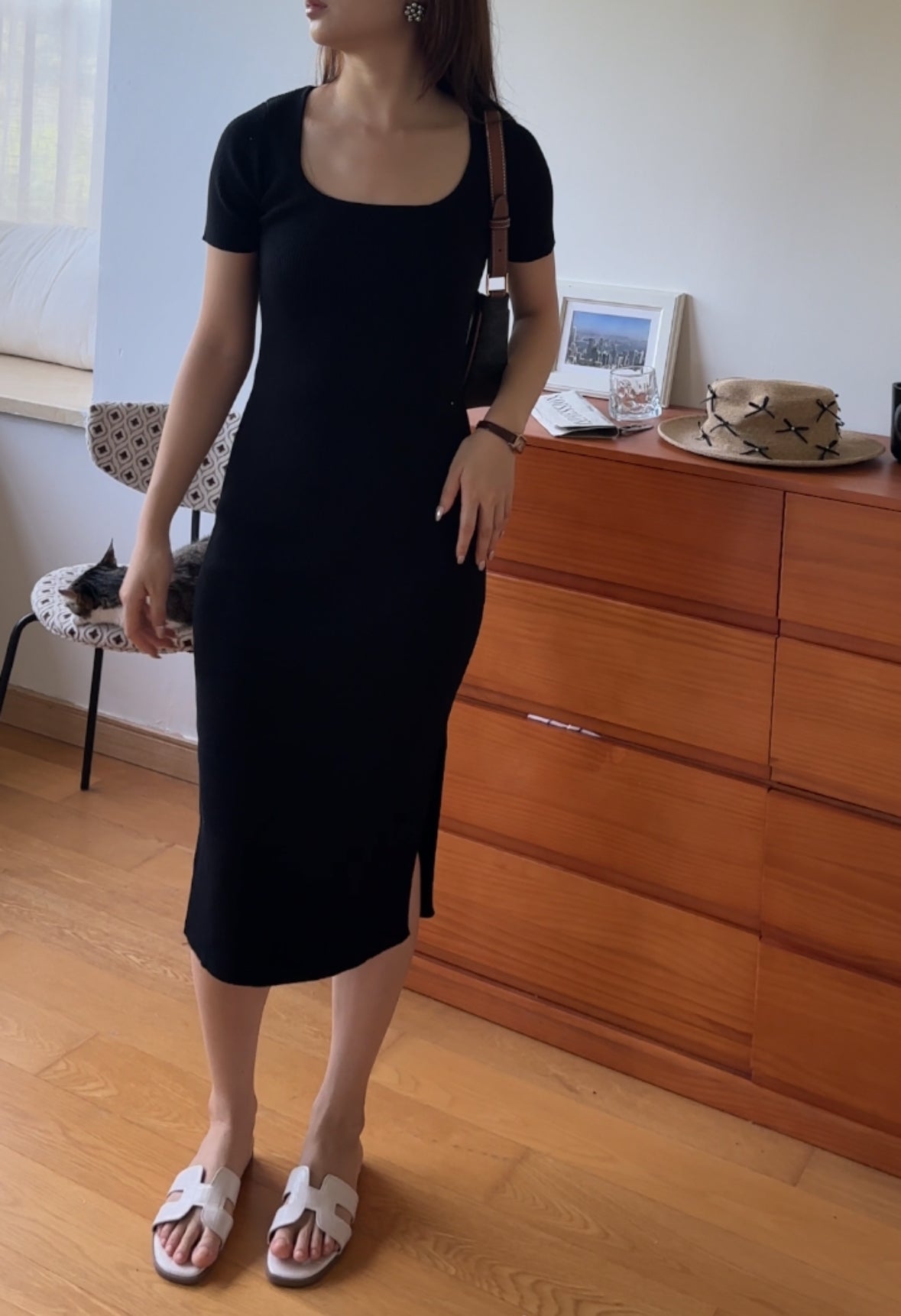 GC06104 Super Stretchy 超彈爽身面料 Square Collar Side Slit Knitted Dress Black