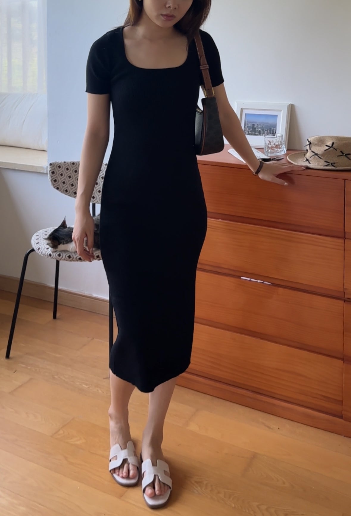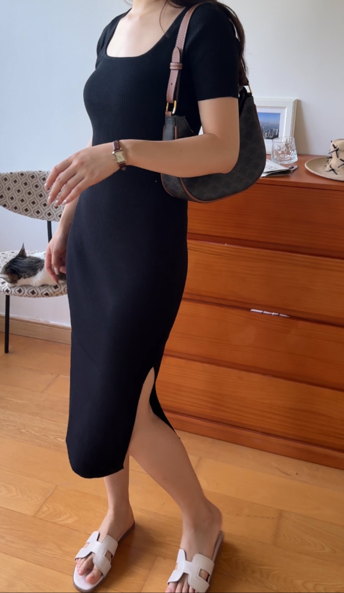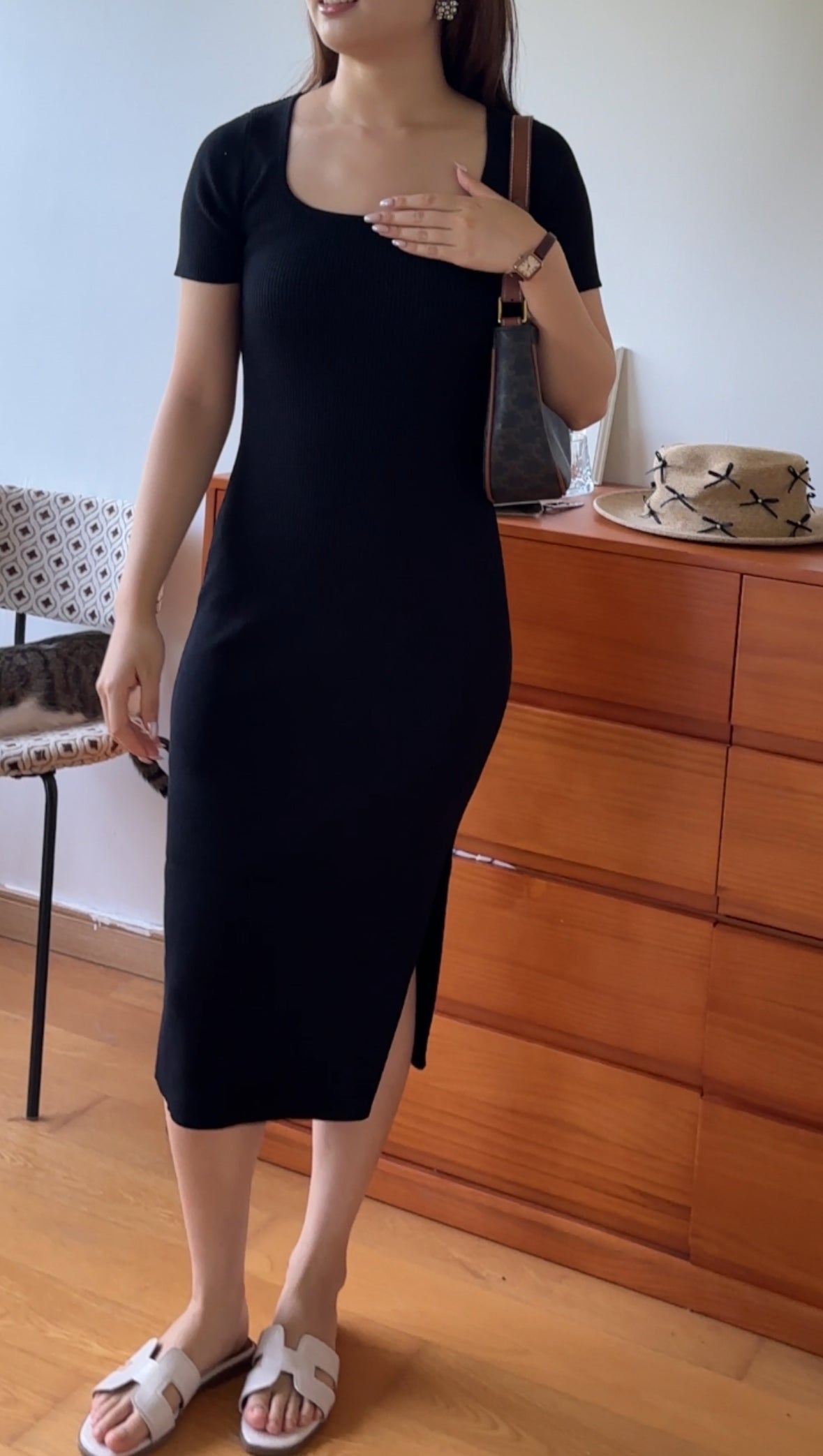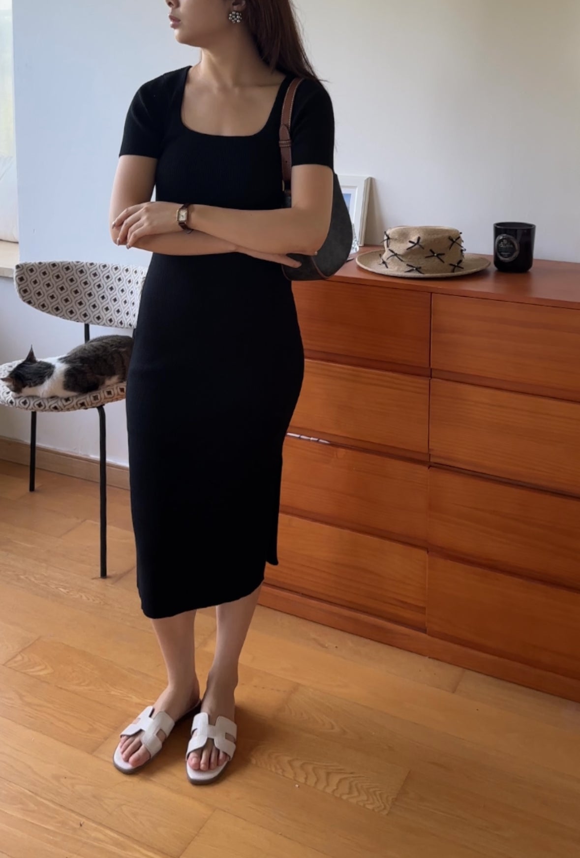GC06104 Super Stretchy 超彈爽身面料 Square Collar Side Slit Knitted Dress Black