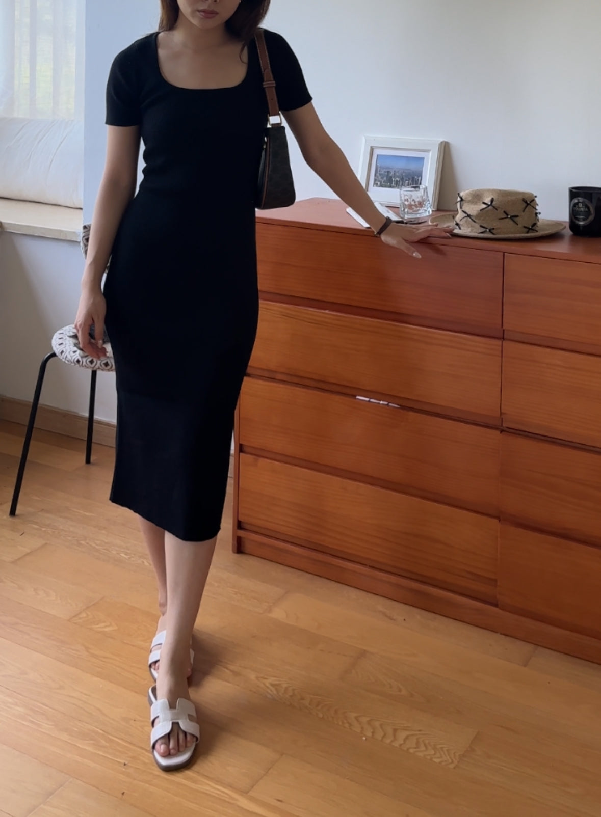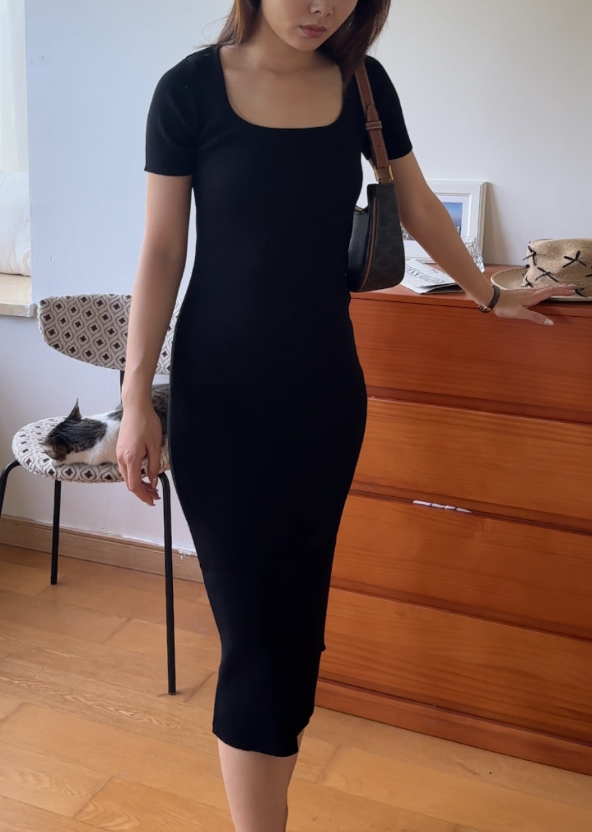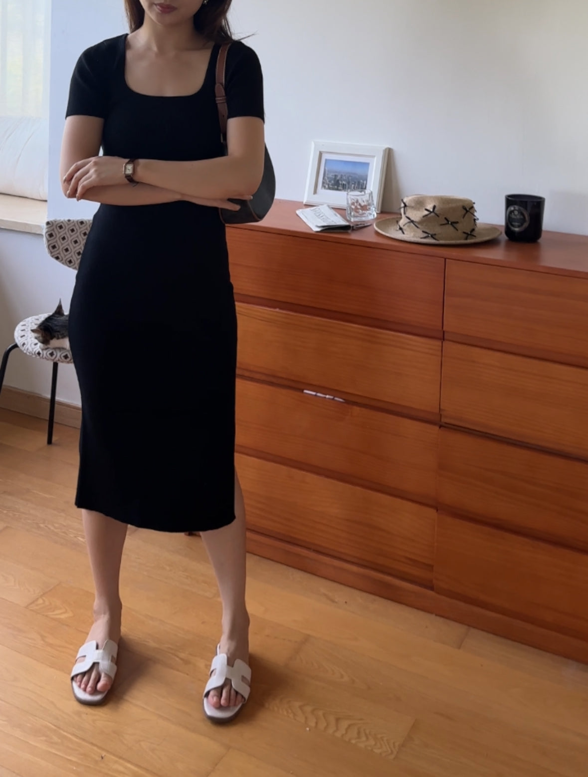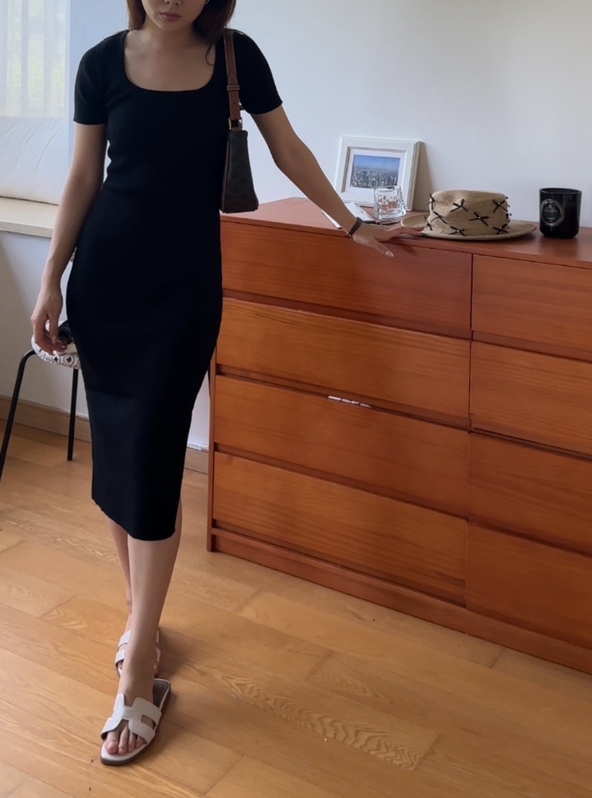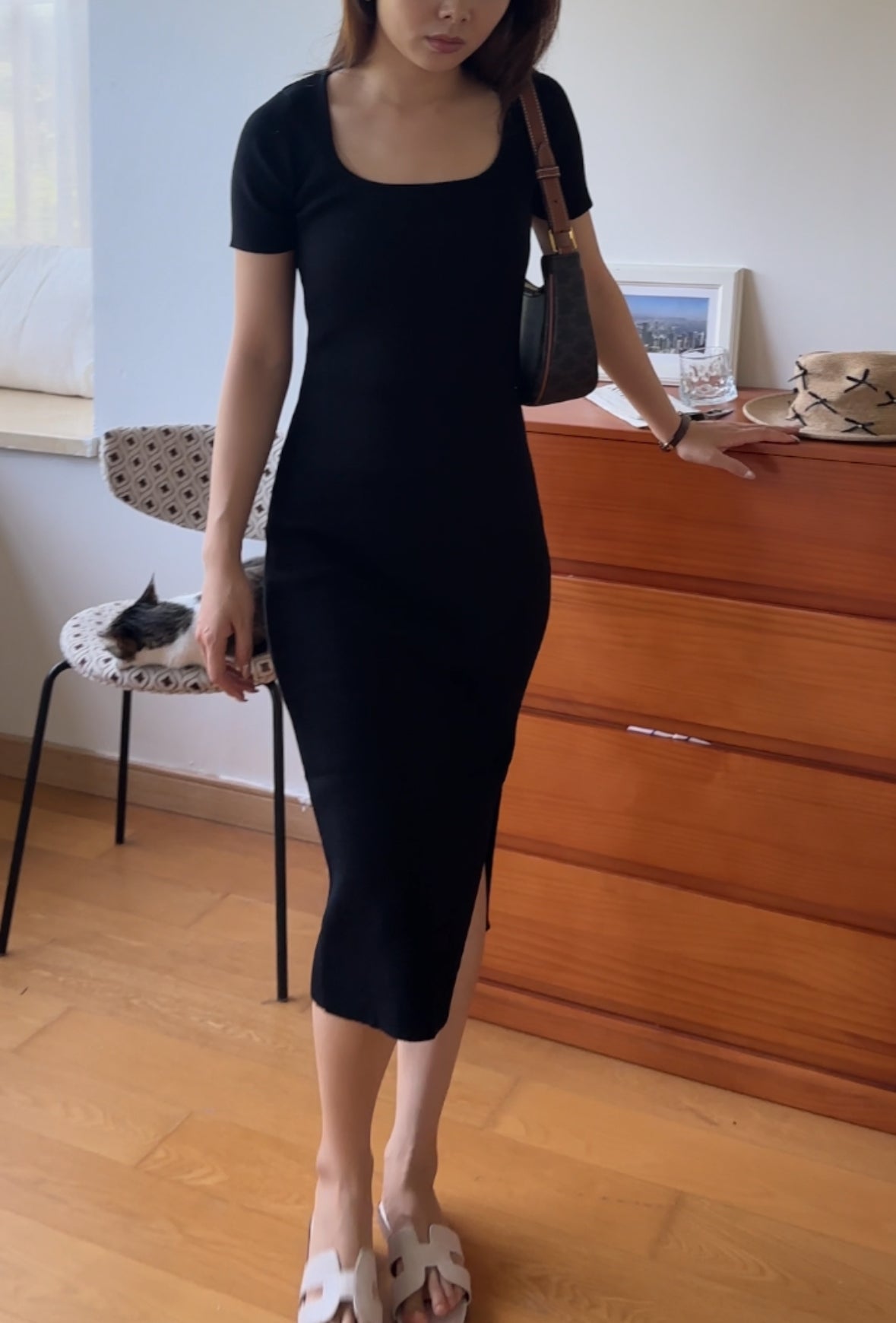GC06104 Super Stretchy 超彈爽身面料 Square Collar Side Slit Knitted Dress Black