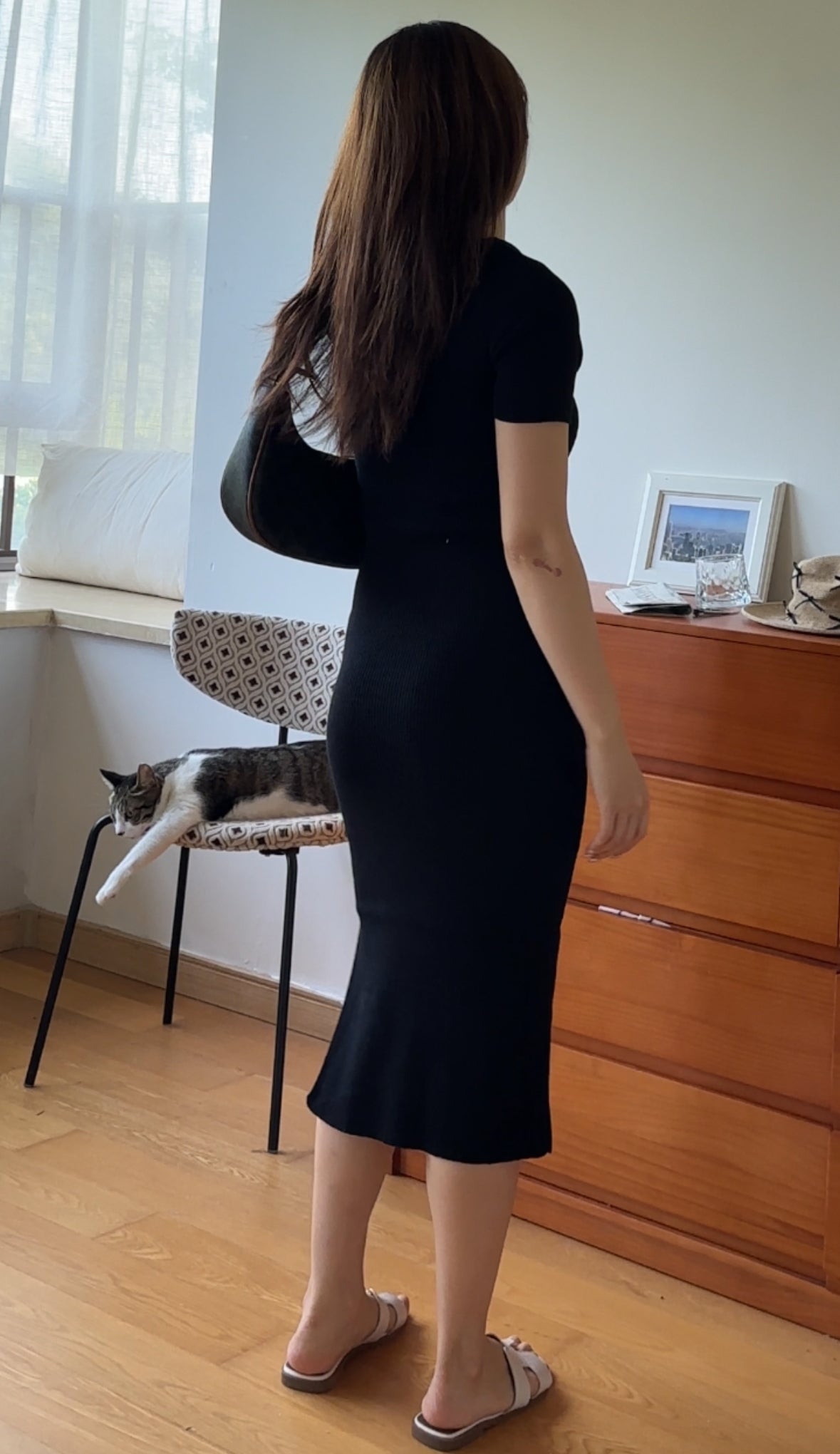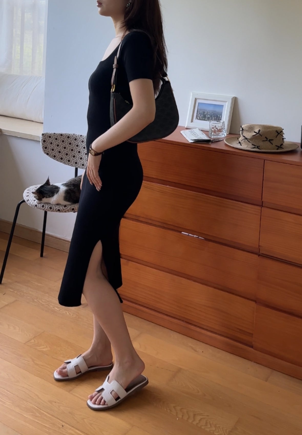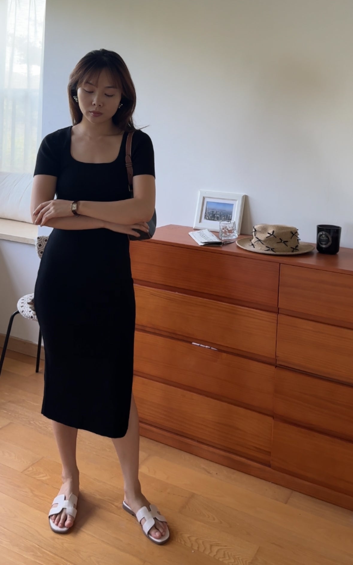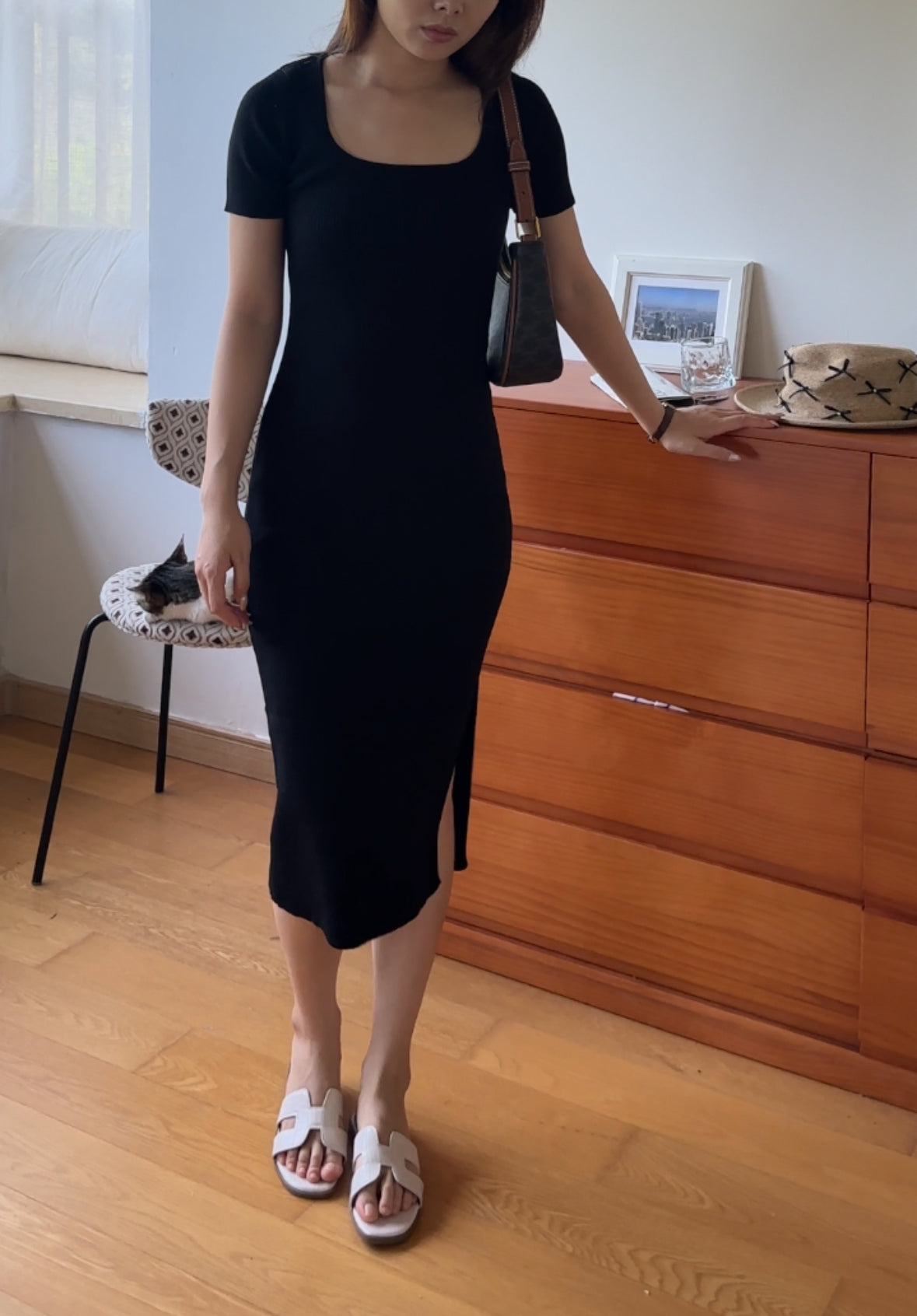 GC06104 Super Stretchy 超彈爽身面料 Square Collar Side Slit Knitted Dress Black
