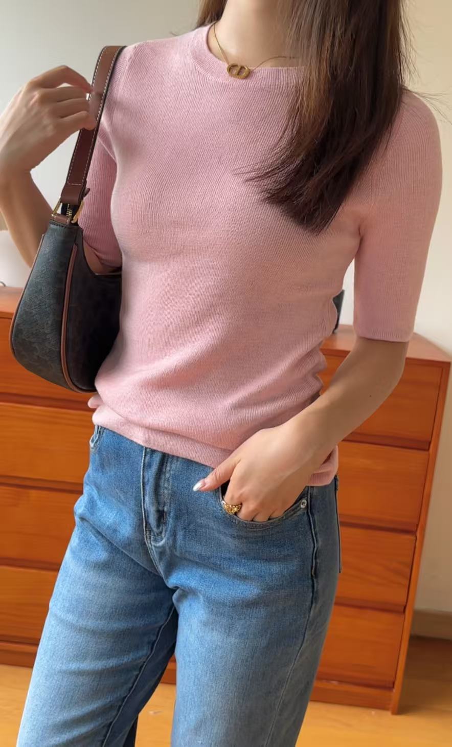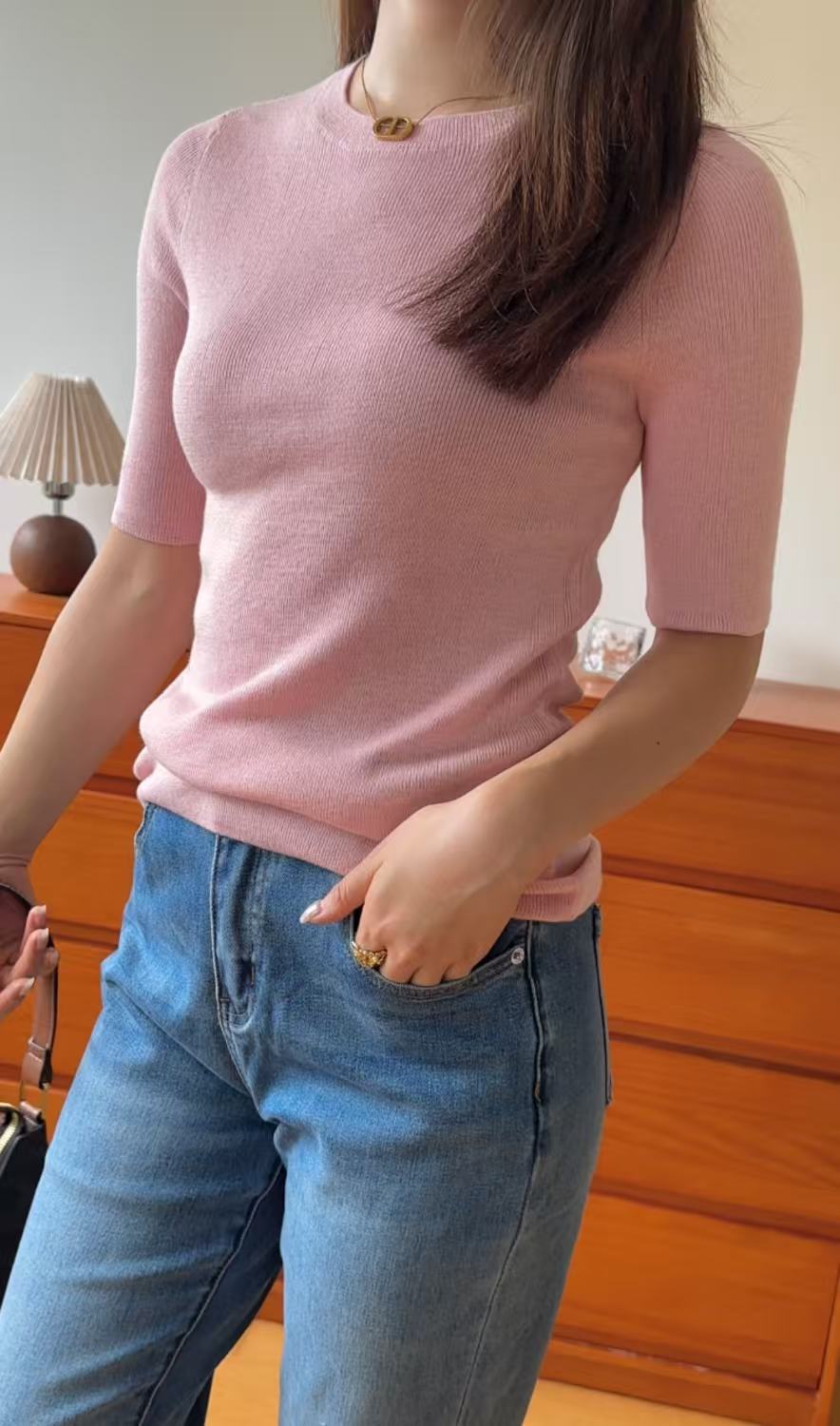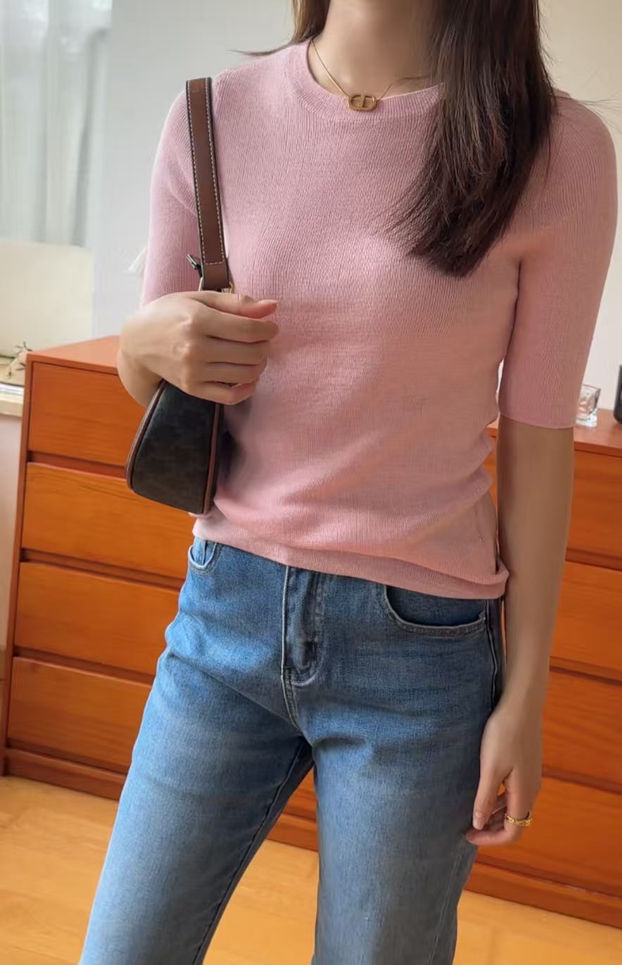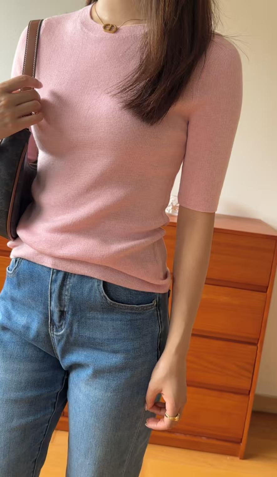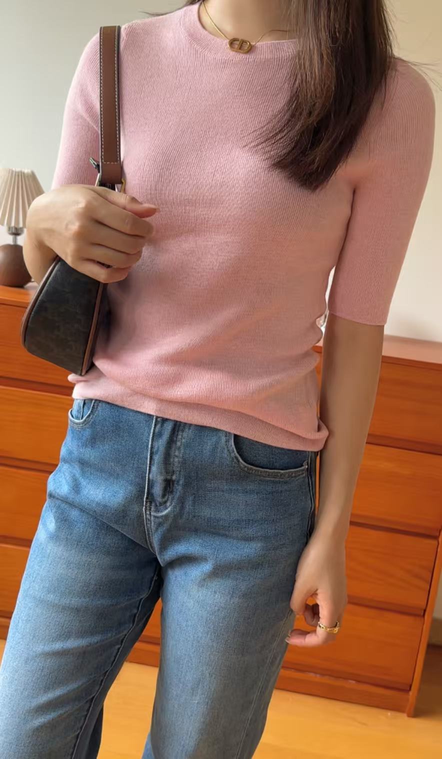 GC10111 Basic Circle Neck Midi-Sleeve Knitted Top Pink