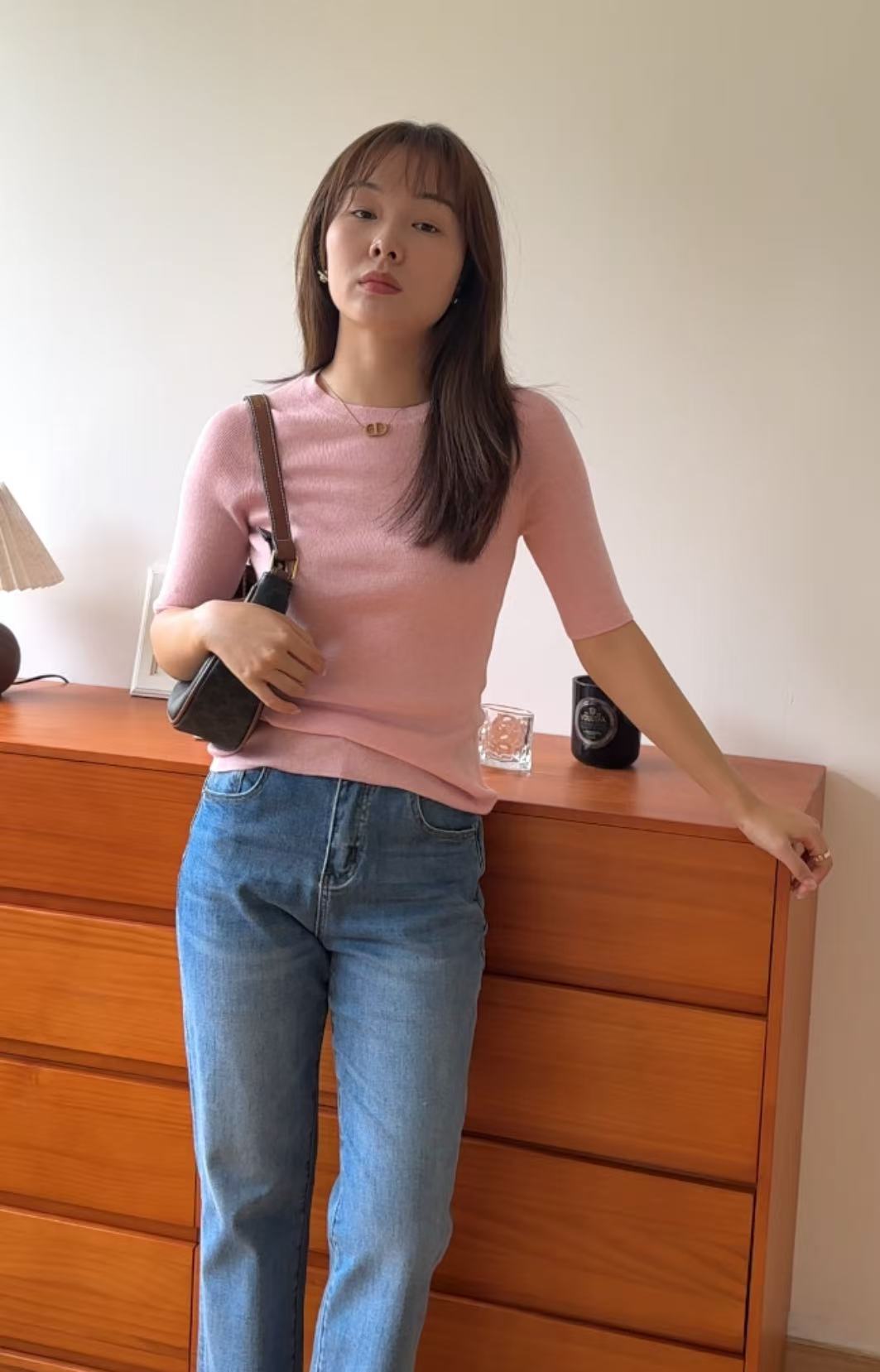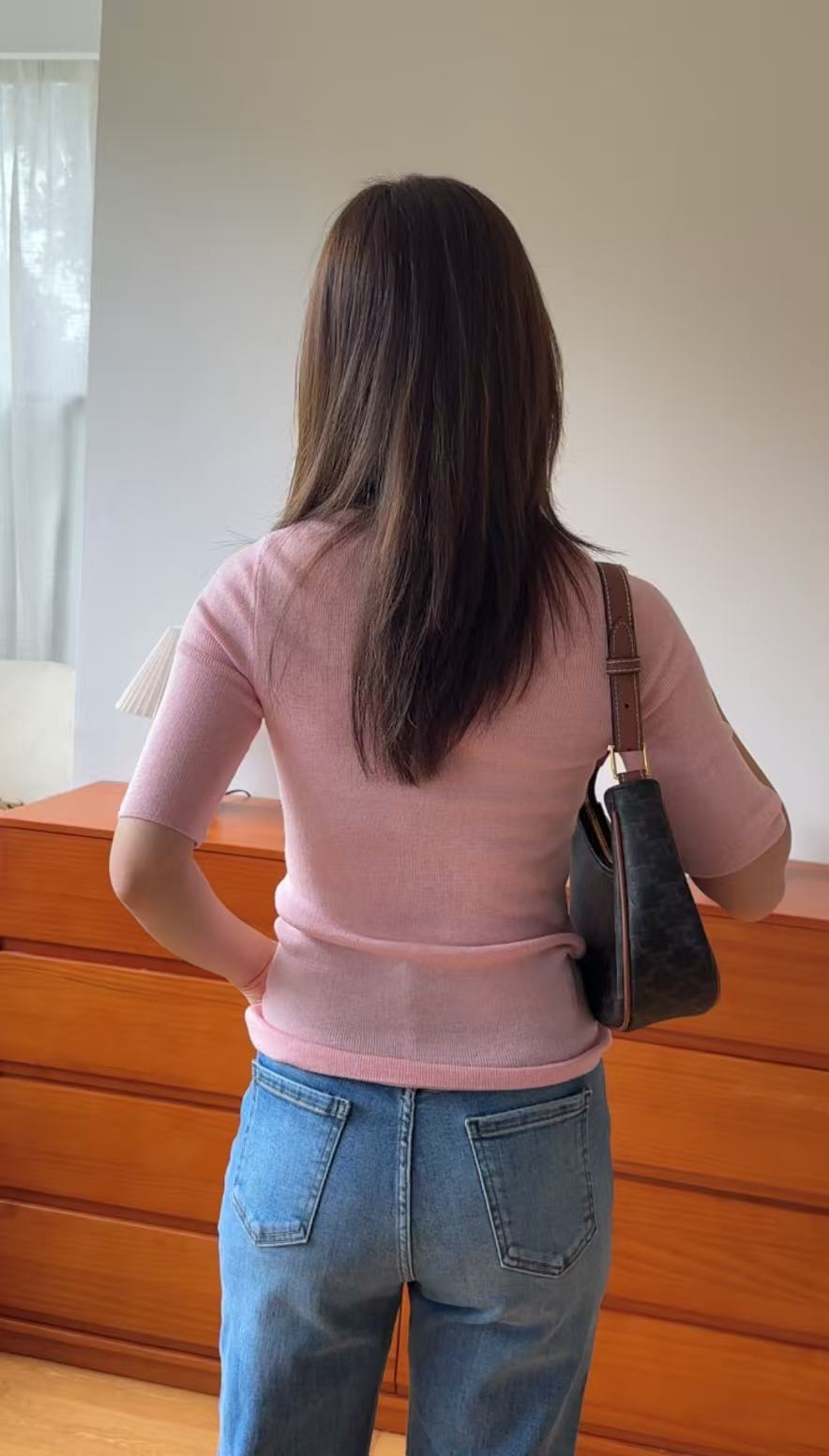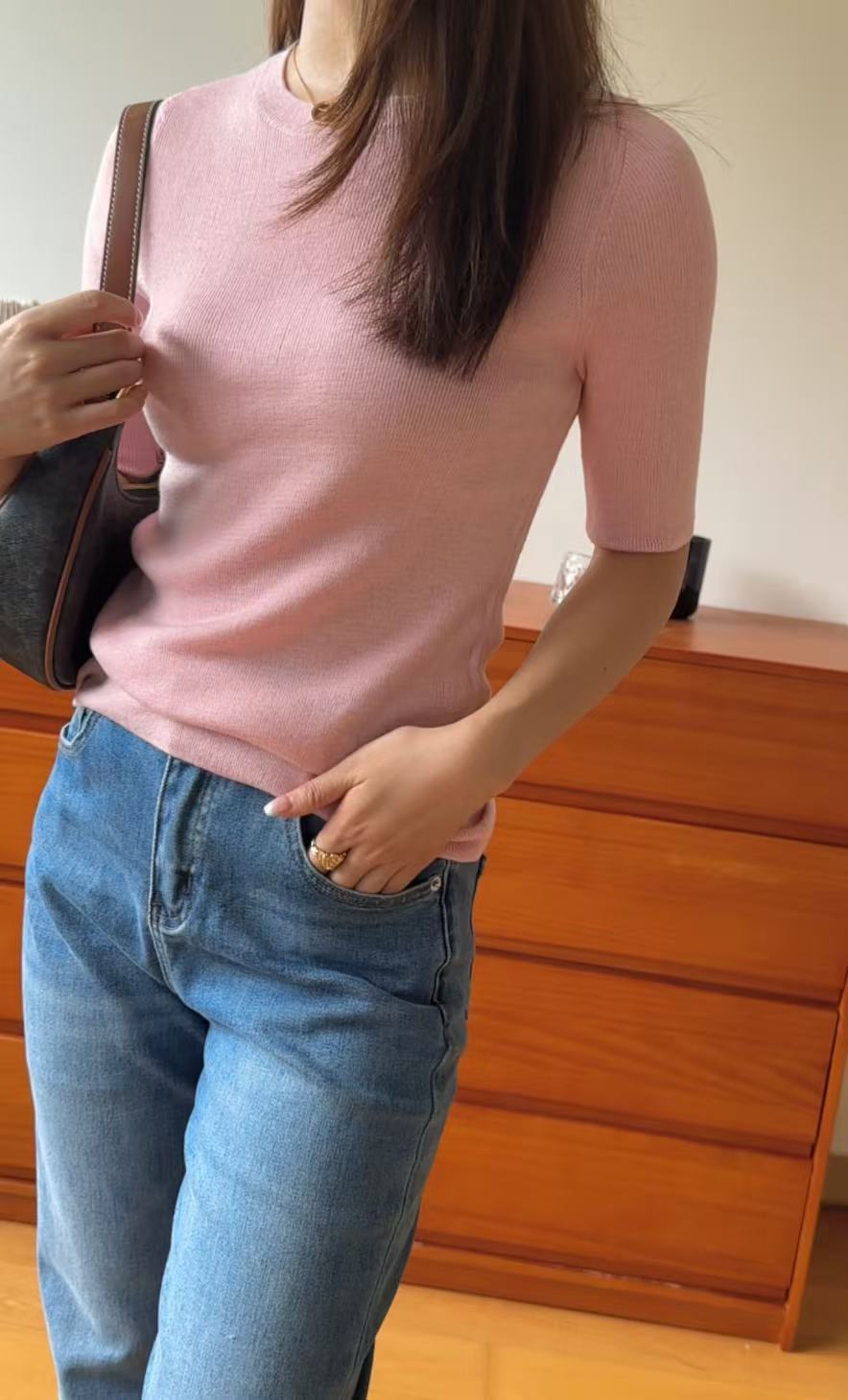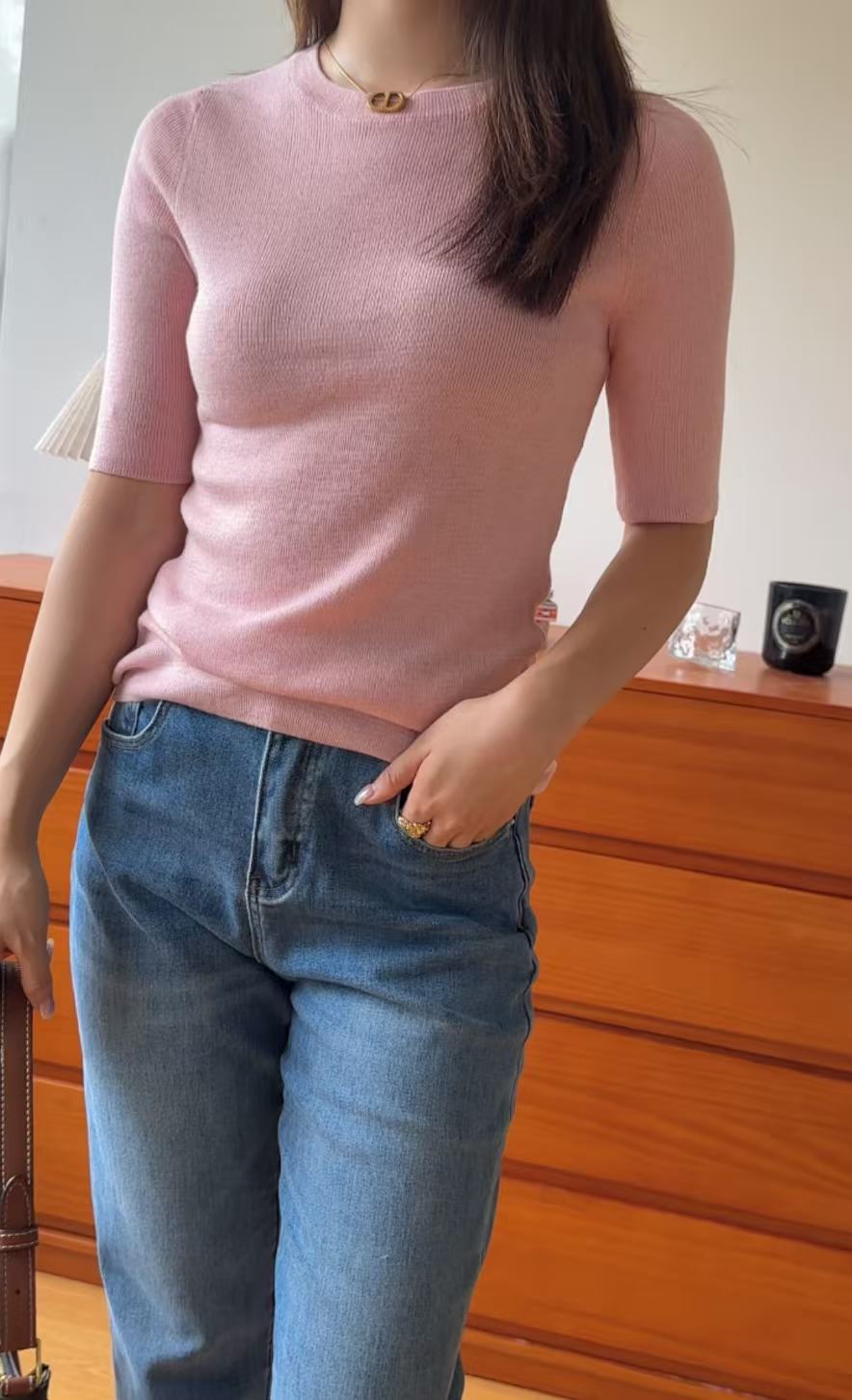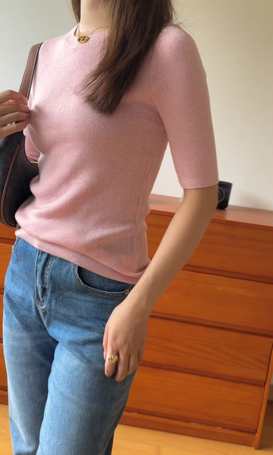 GC10111 Basic Circle Neck Midi-Sleeve Knitted Top Pink
